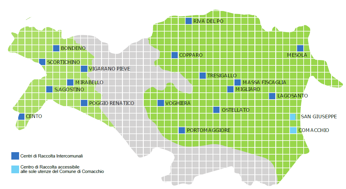 Il Centro di raccolta di Comacchio è invece comunale, ossia fruibile esclusivamente dagli utenti del Comune di Comacchio e non dagli utenti degli altri Comuni serviti da Clara S.p.A.